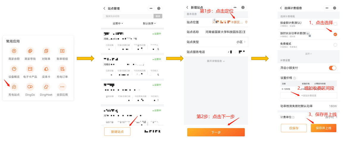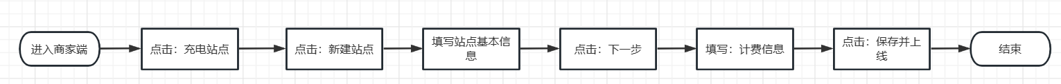 ## 新建站点流程:  ## 图文示例:  注释: 1、选择计费模板:充电计费方式,市场上常规都是【按时长分功率计费】 2、开启小额支付:开启时允许扫码使用一次付一次费用;关闭后扫码充电需要先购买电子卡 3、功率检测失败时默认功率:系统默认180W,保持默认即可 4、计费单位:系统支持按小时、按半小时、按分钟计费,根据当地情况选择即可 5、小额支付最低消费(时长):可配置时间,配置后类似出租车起步价,使用小额支付的充电订单实际充电小于最小时长时按最小时长计费 6、电子储值卡最低消费(时长):建议保持默认:不限