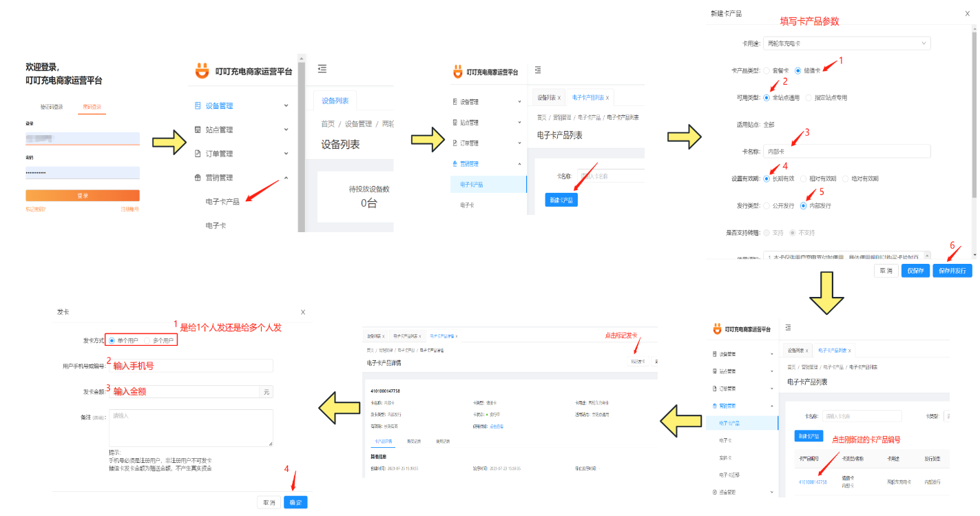 内部发卡用于对特定人员发放免费电子卡,使其能免费充电。内部发卡功能需要在电脑端操作,电脑端网址:https://mms.ddzn.cc/ 。登录账号、密码与小程序账号密码一致。 ## 内部发卡流程:  注意: 1、填写卡产品参数时,要选择内部发行,然后点击保存并发行; 2、填写发卡信息时,发卡手机号必须是叮叮用户,否则会提示发卡失败;非叮叮用户可以先使用微信的扫一扫去扫描任意插座二维码授权成为叮叮用户,然后再内部发卡。 3、发卡金额为赠送金额,不会产生资金收入,也不支持退款。 ## 图文示例: