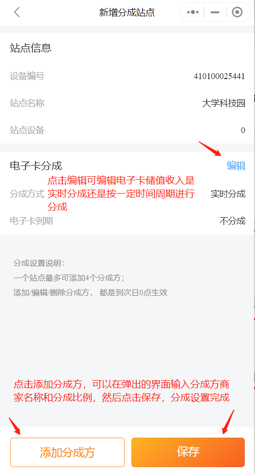 ### 小区谈判中物业要求分成怎么办?合作伙伴一起投资小区,大家一起分润需要分成怎么办?分成设置来帮你 #### 1.进入“叮叮充电商家版”小程序首页,点击“全部应用”,在新界面资金板块找到“分成设置”并点击,如图:   #### 2.点击左下角的“新增站点分成”,如图:  #### 3、选择具体要分成的站点,并点击,站点右侧会出现对号,然后点击底部的“确定”,如图:  #### 4、界面中点击“添加分成方”即可在弹出的新界面输入分成方商家名称和设置分成比例,然后点击保存,分成设置就设置好了  #### 系统自动分账,避免人工分账时多方核对账目、确认分成金额的繁琐,帮你轻松运营。