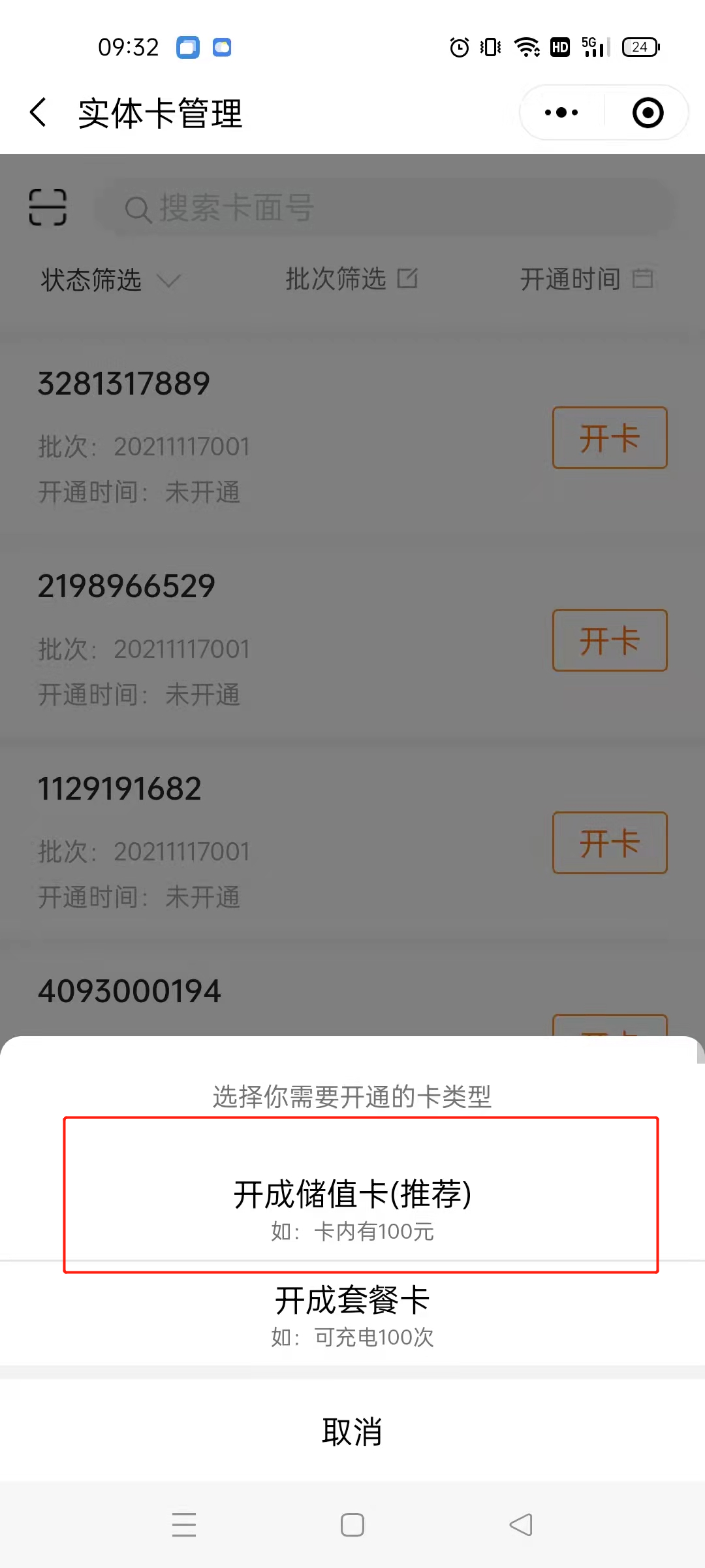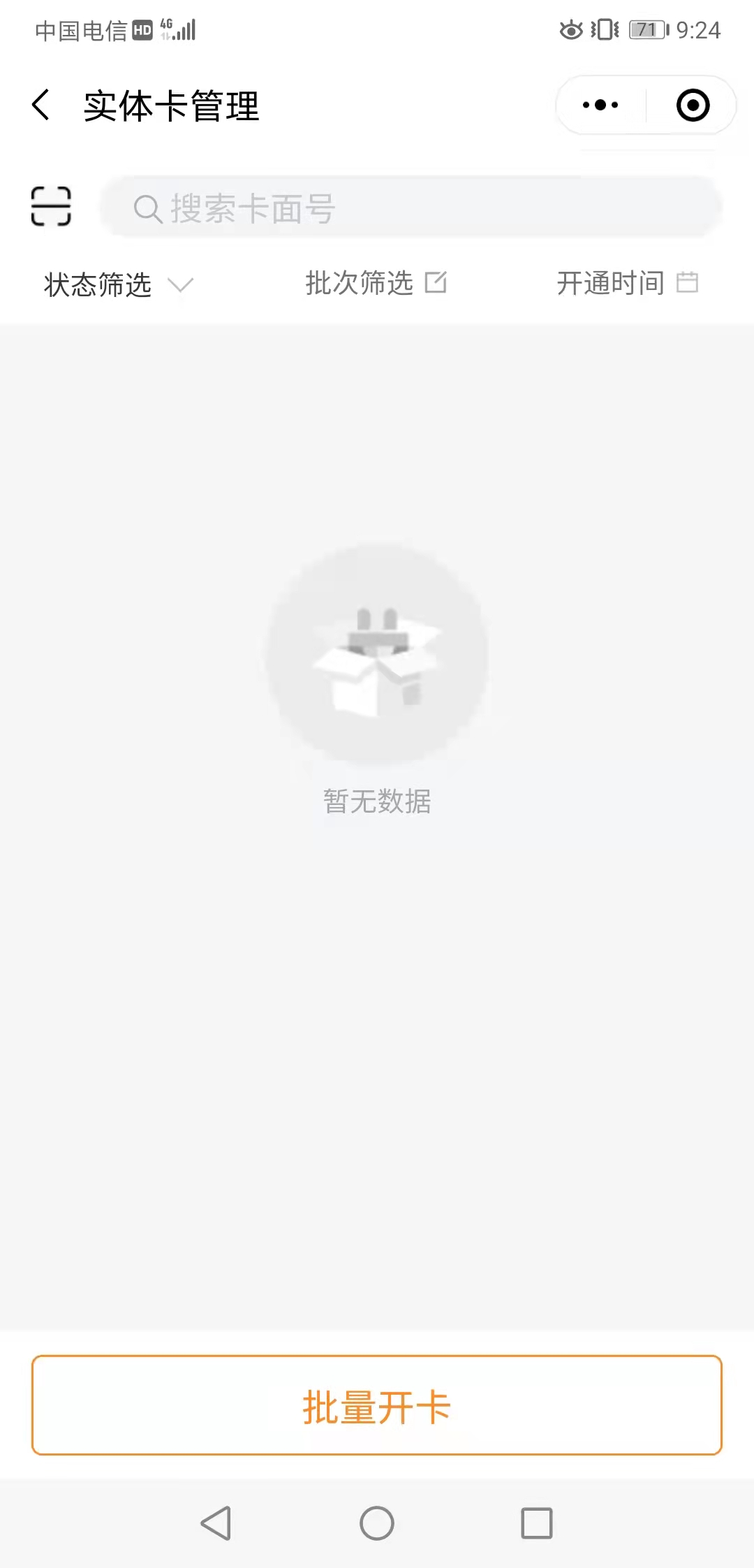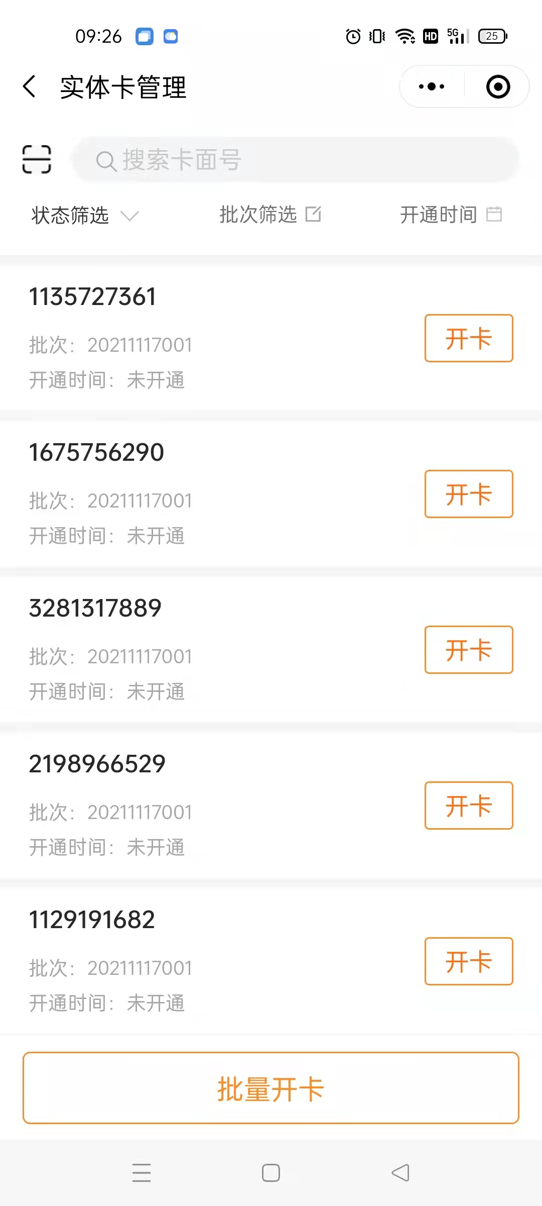 1.进入主页面,点击实体卡  2.如果已购买并收到实体卡但是出现如下页面,售后服务群内联系客户成功给您发卡  3.正常开卡流程,在下方页面点击开卡或批量开卡。开卡一次开一张,批量开卡可以一次开多张。批量开卡选择需要开卡前方的圆圈可以同时选择多张   4.开卡,建议选择开成储值卡  5.开卡设置   6.两种开卡方式:①开卡并预存卡里直接有钱②仅开卡需要用户自己扫码往卡里充钱,充的钱直接到后台账户