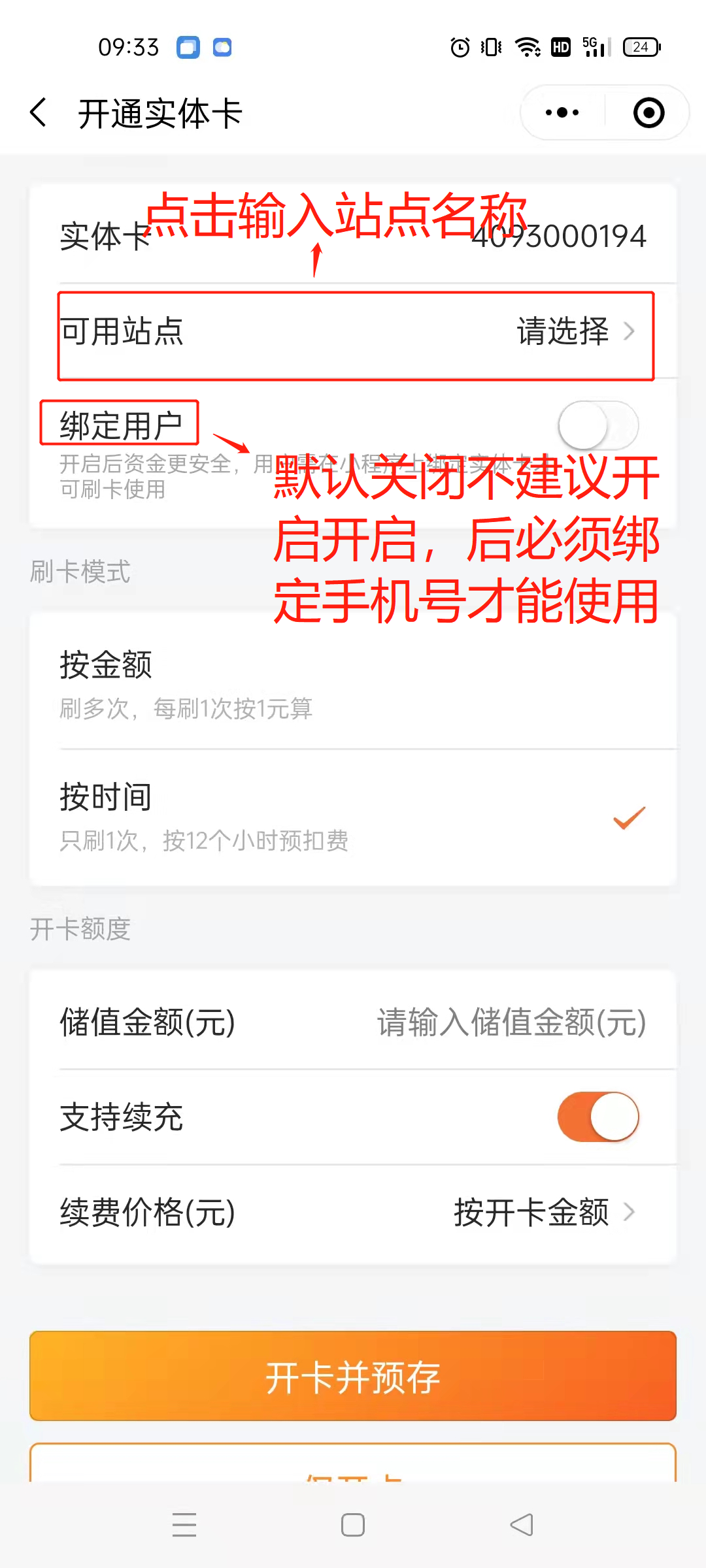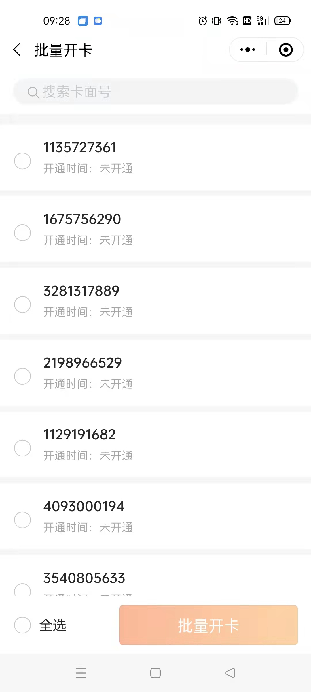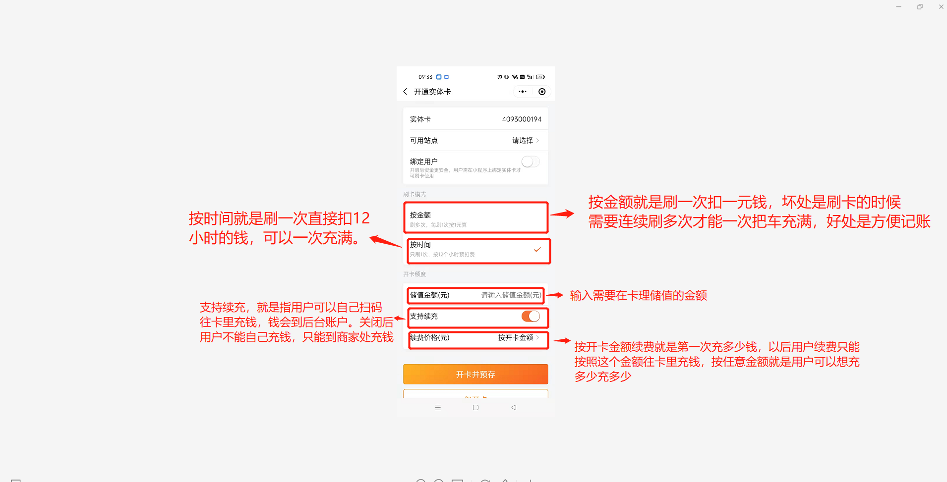 1.进入主页面,点击实体卡  2.如果已购买并收到实体卡但是出现如下页面,售后服务群内联系客户成功给您发卡  3.正常开卡流程,在下方页面点击开卡或批量开卡。开卡一次开一张,批量开卡可以一次开多张。批量开卡选择需要开卡前方的圆圈可以同时选择多张   4.开卡,建议选择开成储值卡  5.开卡设置   6.两种开卡方式:①开卡并预存卡里直接有钱②仅开卡需要用户自己扫码往卡里充钱,充的钱直接到后台账户
