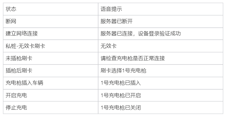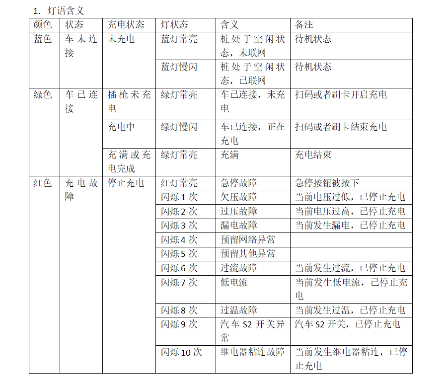 # **汽车桩显示及语音说明20230927** ## **4G模块灯语**  ## **指示灯灯语**  ## **液晶屏显示** 空闲状态显示  充电中显示  充电完成显示  故障显示  ## **语音提示**