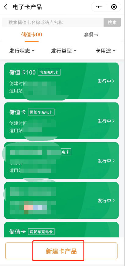 电子卡是商家在线发行的储值卡,通过开通、发行电子卡,有助于更快的回笼投资现金,提升用户使用粘性。那么如何开通电子卡呢?流程如下: 1、打开您的“叮叮充电商家版”小程序,点击“电子卡产品”,如图:  2、在新进入的界面最下方,点击“新建卡产品”,如下图顺序操作:   解释: 1、卡用途:目前分为两轮车充电卡和汽车充电卡,根据自己安装电桩的性质选择 2、“全站点通用”指商家名下全部站点(不含有分成的站点)通用,即:购买1张电子卡在商家其它站点也可以使用; “指定站点专用”指仅限在指定的某一个站点使用,即:购买后该电子卡仅限在指定的那个可用站点使用 3、储值卡名称:给自己的储值卡起一个名字 4、发行类型:“公开发行”指卡片发行后,扫码充电的用户都可以购买;“内部发行”指卡片发行后,扫码充电的用户不可以购买,仅商家可以在后台给别人赠送 5、有效期:“长期有效”,用户购买后长期有效;“想对时间”,用户购买后开始数天数,N天后过期,不可使用;“绝对时间”,固定的时间段可以使用,需要设置开始时间和结束时间,在设定的时间段内可以使用,过期作废 6、储值档位:“储值金额”用户需要支付的金额,“赠送金额”用户支付前面的储值金额后得到的赠送金额,比如:储值金额50元,赠送金额2元,用户购买时需要支付50元,实际到达账户52元 7、“支持自定义储值金额”,用户可以随意储值1--100000之间的任意整数金额,默认关闭,不建议打开 8、支持转赠:支持用户购买后将余额赠送给别人,建议打开 9、“保存并发行”:保存您上边的设置,并发行卡片,用户扫码充电时就可以开始购买了;“仅保存”:仅仅保存您上边的设置,用户扫码充电时还不可以购买