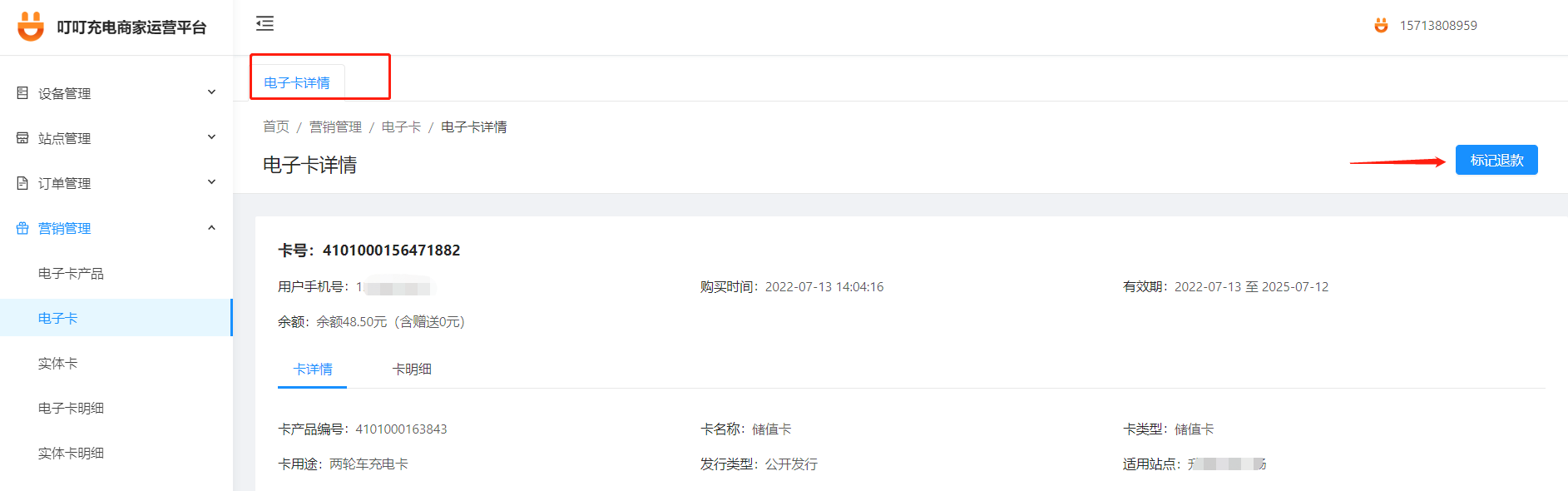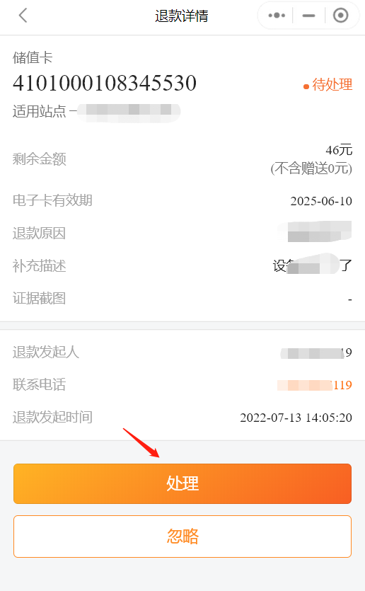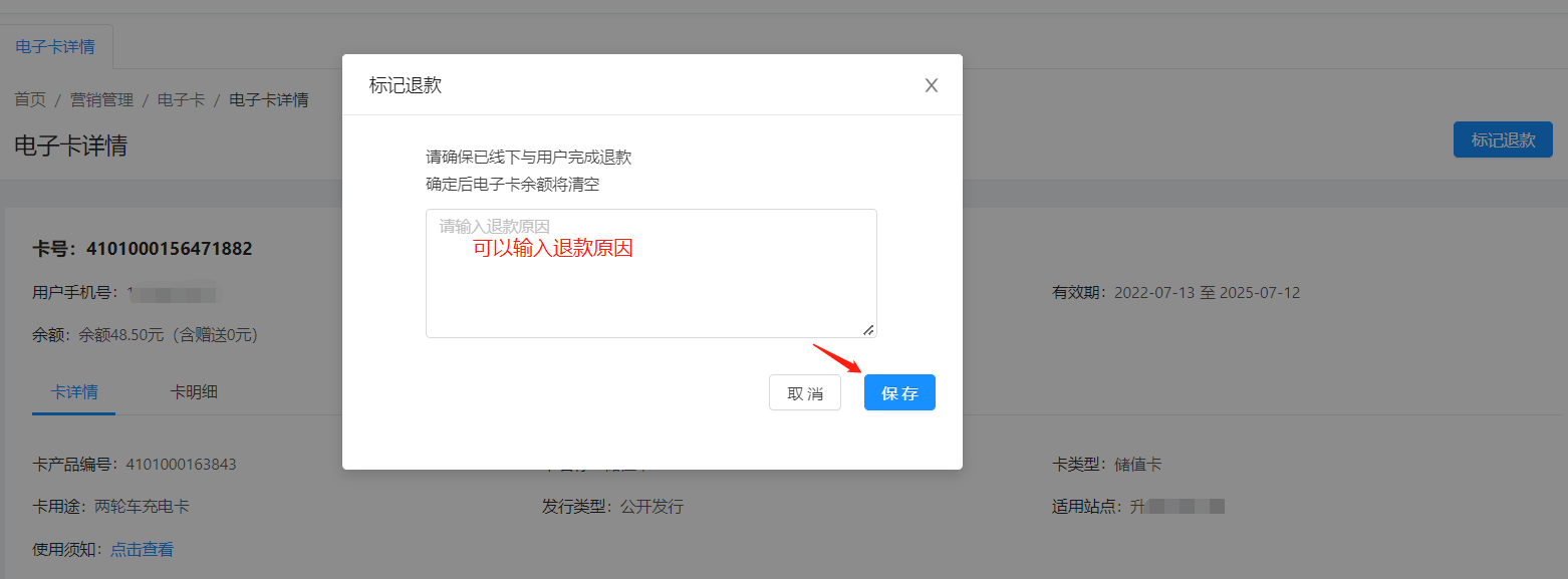 ### 用户购买电子卡后,遇到搬家不使用了等申请退款,该怎么办呢?以下方案帮助你 #### 1.如果你的电子卡产品支持转赠功能,可以建议用户使用转赠功能把电子卡转正给亲朋或邻居,如果用户接受转赠,问题解决 #### 2.如果用户不接受转赠,要求退款,要看你的商家是否开通了在线退款功能 ##### 2.1如果你的商家开通了在线退款功能,用户可以在我的电子卡里面申请退款,这时你的商家端首页会有电子卡退款待处理提醒,点击去处理即可处理,处理后,退款金额原路退回(用户购卡时使用银行卡支付的还退回银行卡、微信余额支付的退回微信余额……),具体如图: 2.1如果你的商家开通了在线退款功能,用户可以在我的电子卡里面申请退款,这时你的商家端首页会有电子卡退款待处理提醒,点击去处理即可处理,处理后,退款金额原路退回(用户购卡时使用银行卡支付的还退回银行卡、微信余额支付的退回微信余额……),具体如图:   ##### 2.2如果你的商家没有开通在线退款功能,可以在电脑端“营销管理”板块下“电子卡”中搜索用户手机号找到对应的电子卡,在电子卡详情右上角的“标记退款”,标记退款后用户电子卡余额清零,需要通过微信/支付宝转账给用户对应余额金额,具体如图: 2.2如果你的商家没有开通在线退款功能,可以在电脑端“营销管理”板块下“电子卡”中搜索用户手机号找到对应的电子卡,在电子卡详情右上角的“标记退款”,标记退款后用户电子卡余额清零,需要通过微信/支付宝转账给用户对应余额金额,具体如图: